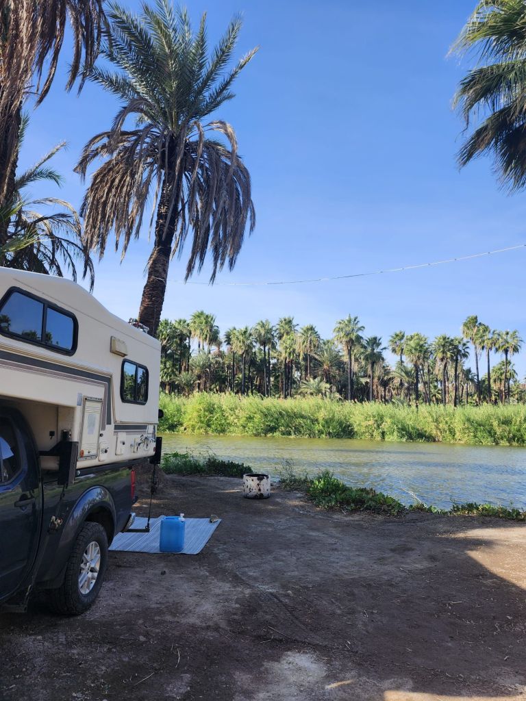 Again I’m so surprised that Baja is this mountainous. As we drop down into San Ignacio there is a change in warmth and in wind. Hot and windy. Baja is known for winter wind and we have definitely had some experiences with the intensity of it. We stay at Los Petates for 3 night over the New Year holiday. $250 pesos/night with flush toilets a warm, trickling shower and use of their kayaks and canoe. This is the cheapest we have paid so far. Los Petates is leased by a very friendly expat from the US. The campground and San Ignacio has recently experienced a fire and more recently a flood. The damage is apparent throughout town, but people are working to repair it. All around the lagoon are large date palms. We picked some right off the ground to sample.