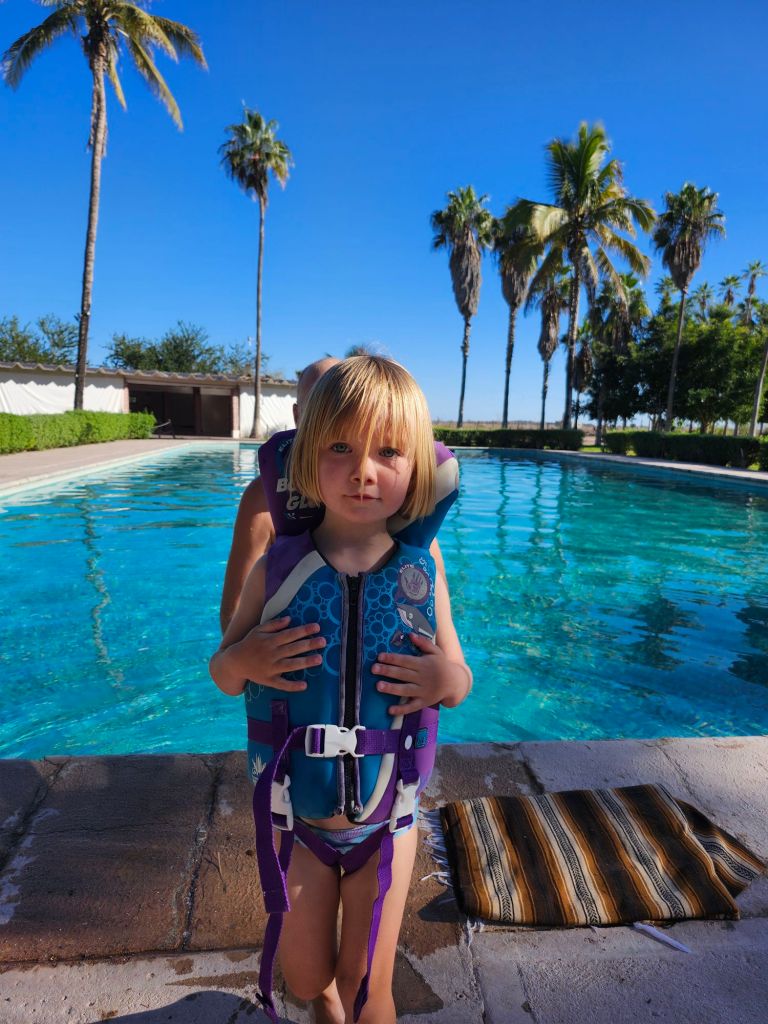 It seems as if less tourists stop here. Everyone seems less “tourist tired”. We were greeted with smiles and a very helpful disposition. Both local men and women are very interested in Olive. They always stop to approach us and ask her questions, and they are so impressed when she can answer in Spanish…even if it’s a few words. We (of course) get lost trying to find our way to the campsite. We arrive to find a gem of a campsite. $350 pesos and we get a pool and playground all to our selves. Showers and flush toilets are also included.