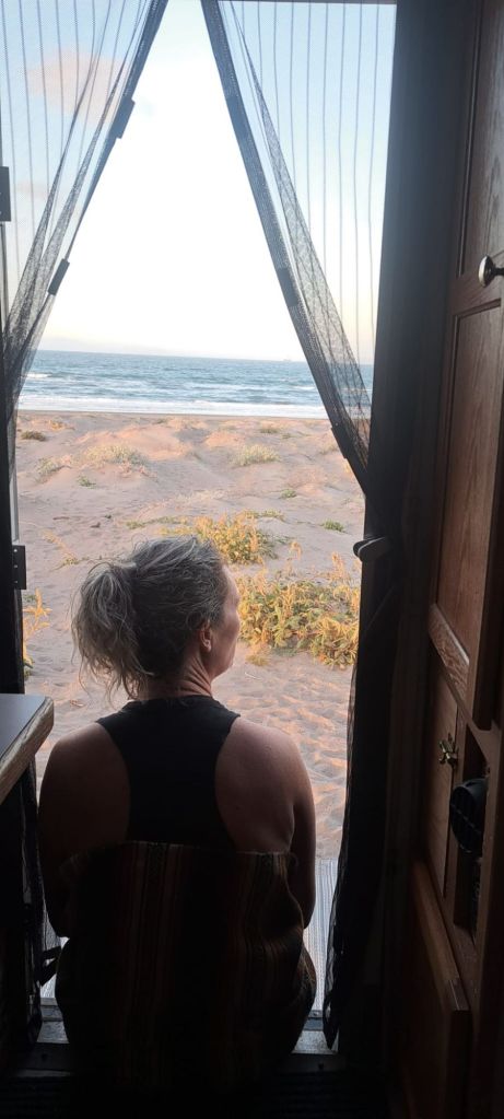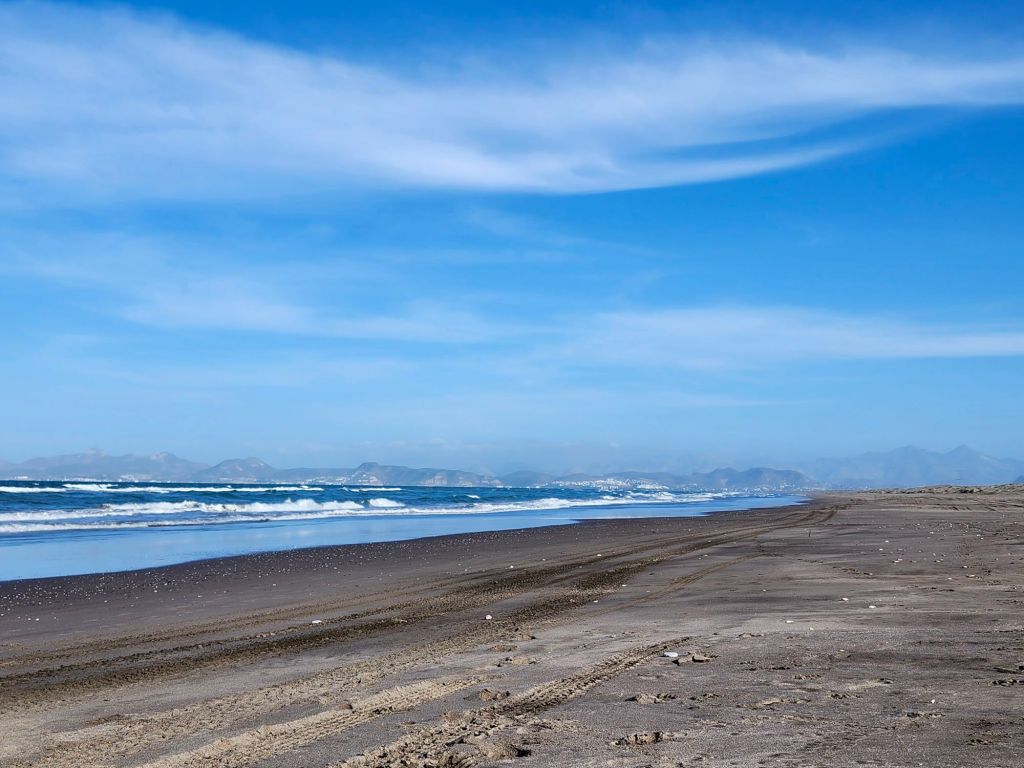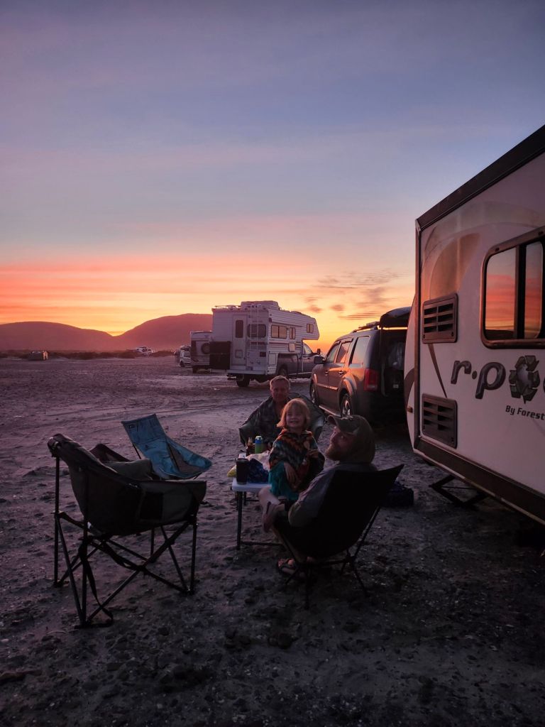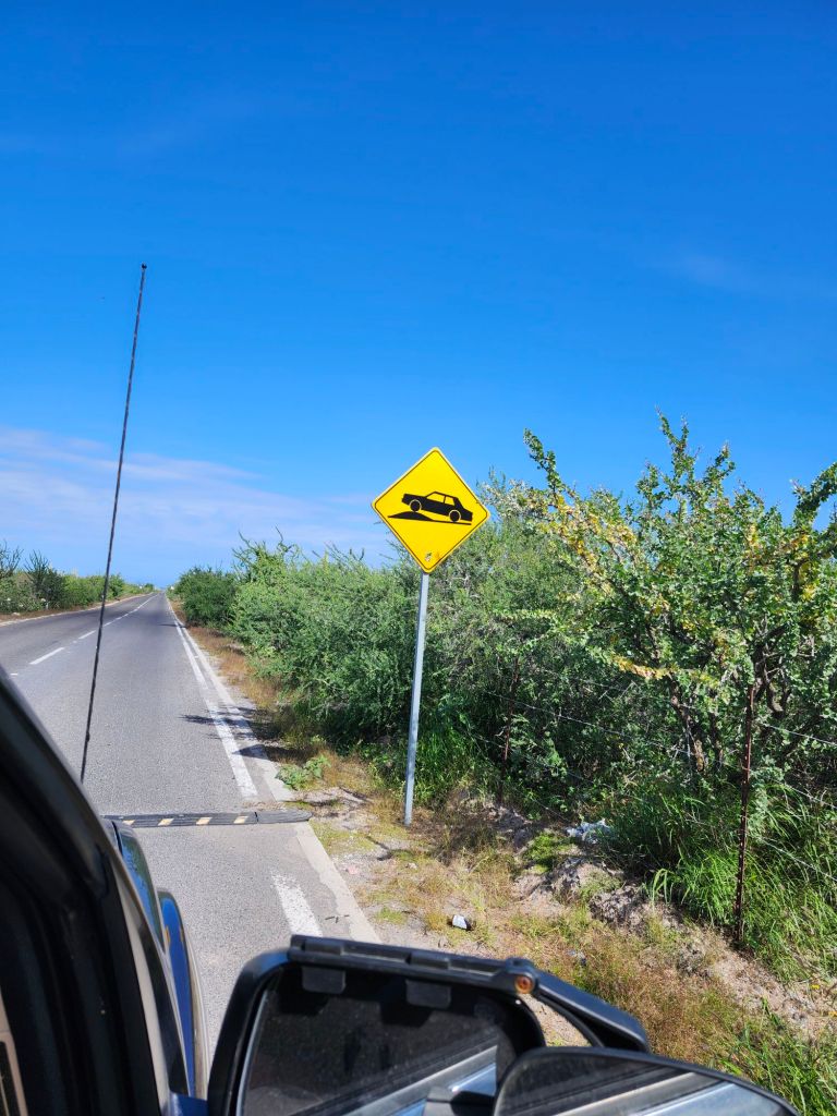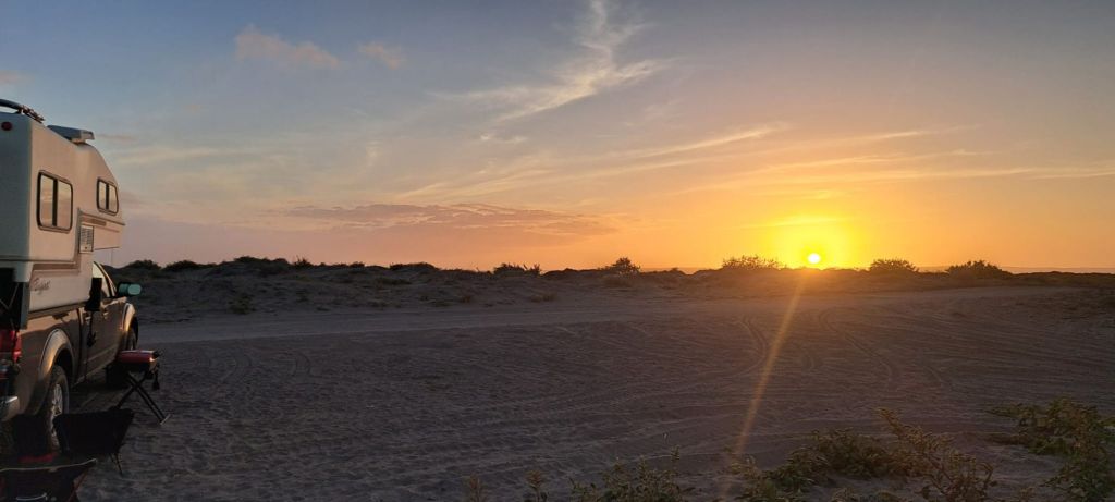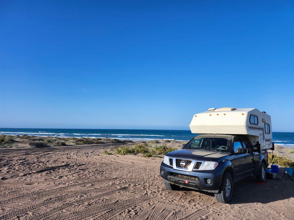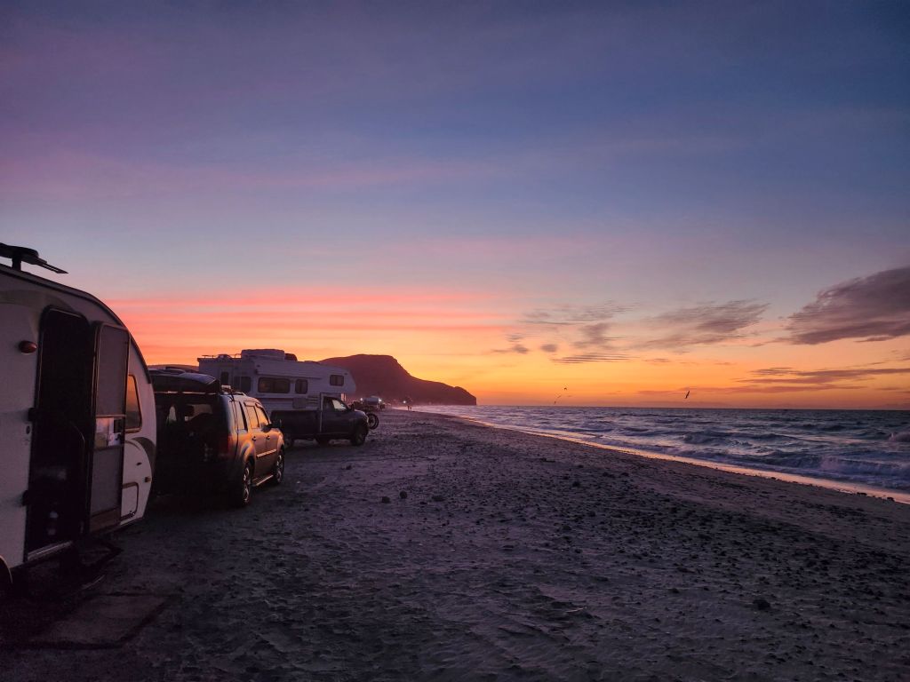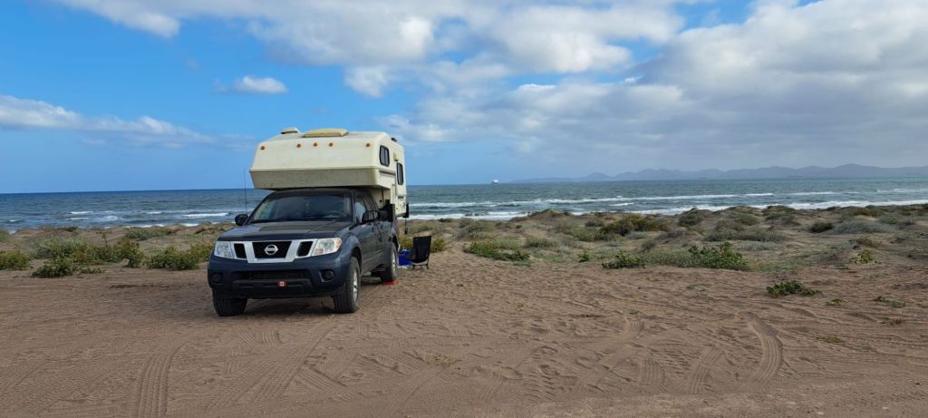 We get our first wild camping experience just North of La Paz. Ioverlander takes us to a sand peninsula with sand dunes separating the road from the Sea. The water was much to fierce for us to go in. Instead we walk the beach looking for sea treasures and running in the waves. Something to note if you plan to drive in Mexico, topes are speed bumps of varying size. Some are little blips and some with send you sailing. Also there are 3 types of topes: the tope that has a sign indicating so, the tope that has a sign but no actual speed bump, or the tope that is not marked. So keep your whits about ya.