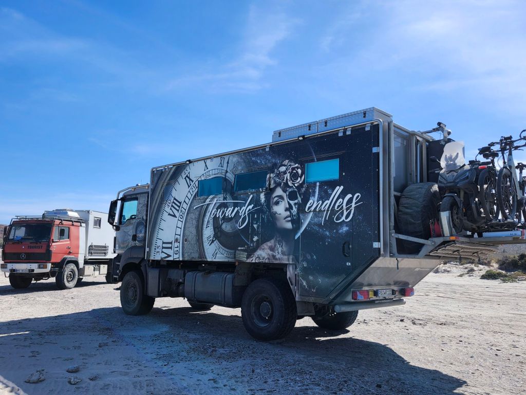 A short walk down the beach are a few restaurants serving the travelers. The top left picture is a truck shipped from Germany. Not sure why but we have seen many and they are almost always German. This couple was continuing on the Pan American highway. They are ridiculously massive!