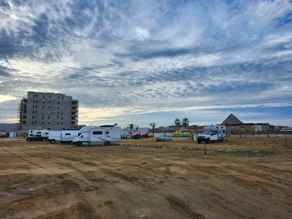 Just for a quick look we drove through the main tourist street in Todos Santos. We continued to Playa Los Cerritos to find a place to camp for a few nights. While Todos Santos is a major hub it’s not directly on the water and Cerritos Beach is a 10 minute drive from Todos Santos. $500 pesos/night gets us a parking lot with flush toilets and cold showers, unlimited potable water and a 5 minute walk to the beach.