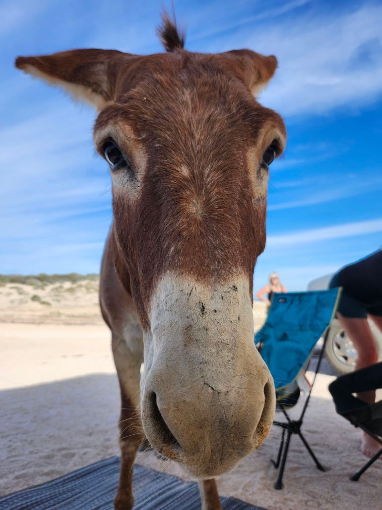 “Brad” the burro was very interested in our camp, walking right under our sun shade and onto our camp mat.