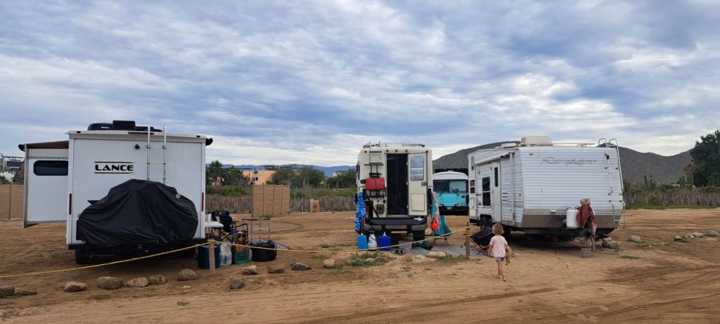 All along we are wild camping and restocking. We stayed at a campground in Los Barilles to clean up. Our wild camp shower situation is not ideal but when you are several days in with no shower, a fertilizer pump sprayer set out in the sun to heat works pretty well. (Note the black pop tent beside the camper, 2 pictu) Los Barilles is known to be windy and as such is a hub for wind and kite surfing.